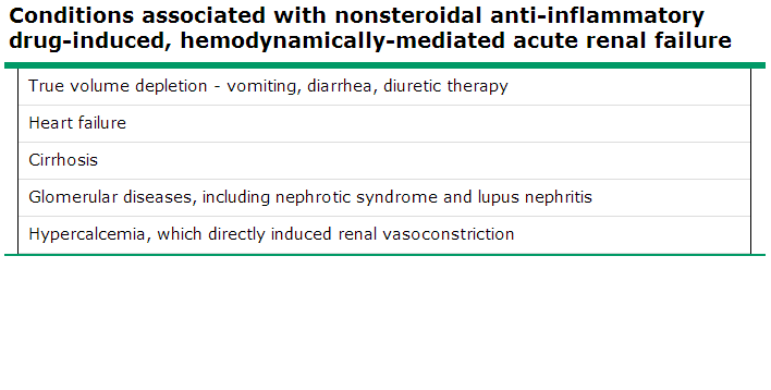 Khả năng gây suy thận cấp với NSAIDs có liên quan tới cường độ sự co mạch thận: Ở những bệnh nhân với tình trạng giữa natri đáng kể (và mức độ cao hơn các hormon nói trên) thường bị giảm nhiều mức lọc cầu thận nếu dùng NSAIDs (điều này có nghĩa là NSAIDs làm ức chế tổng hợp prostaglandin --> mạch máu thận vẫn trong tình trạng co nhiều (bởi như chúng ta biết thì trong tình trạng thiếu máu, các mạch máu ngoại vi phải co lại để đủ lượng máu cung cấp cho não và mạch vành và thận được xem là một cơ quan ngoại vi) --> giảm tưới máu thận, giảm lọc, tăng tái hấp thu/giữ nước).